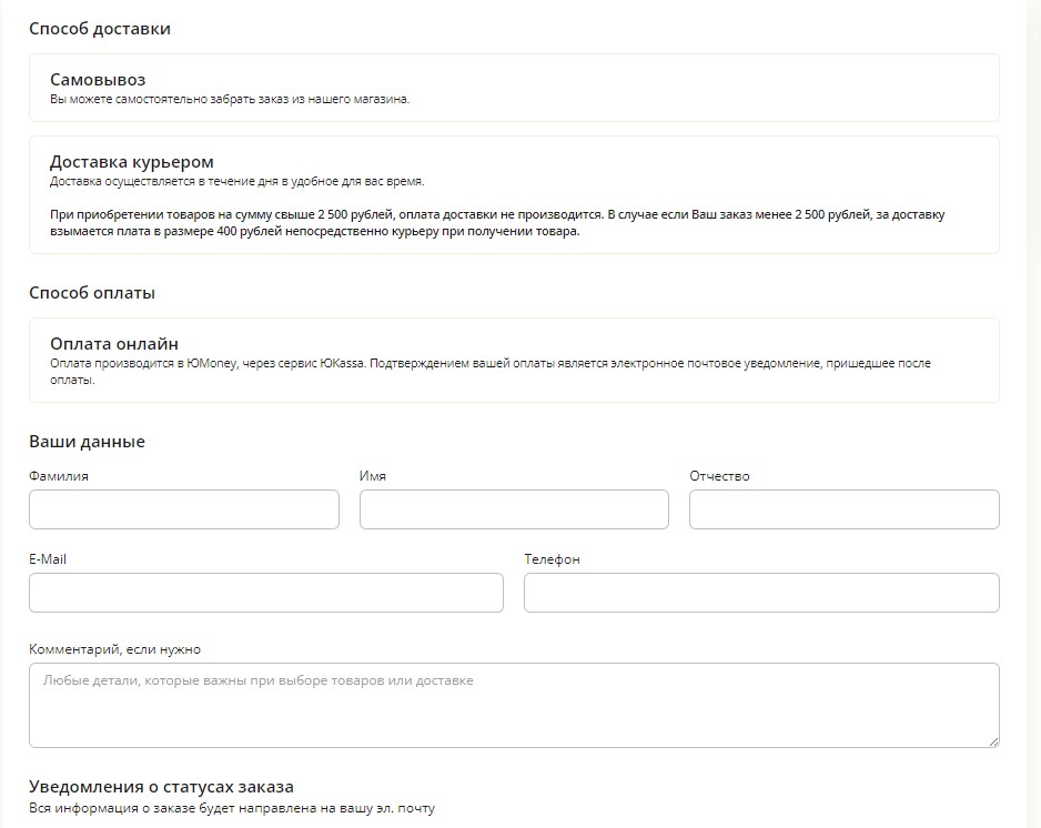 Здесь необходимо выбрать способ доставки (Самовывоз/Доставка курьером) нажав на необходимый вид доставки.